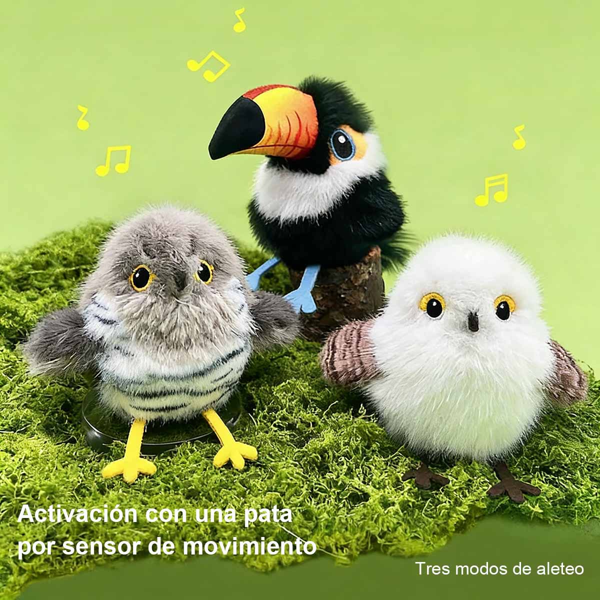 🐦 **Tres adorables aves**: Tucancito, cuco y carbonero blanco. Estampado tipo pluma + alas que aletean, despertando al instante el instinto de caza del gato.